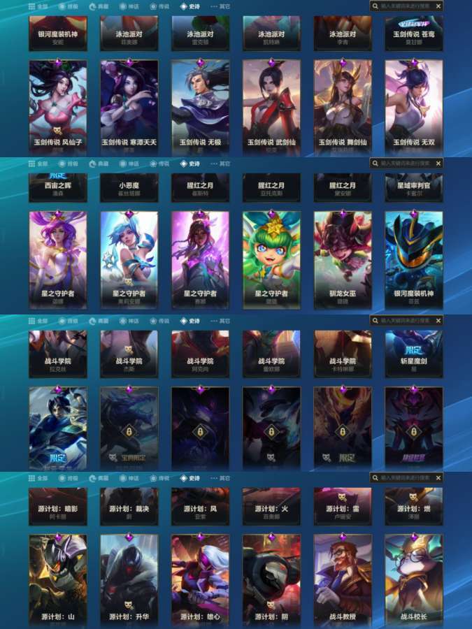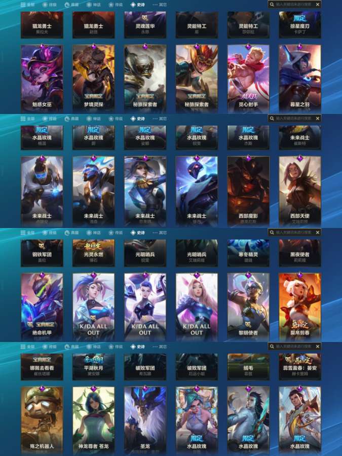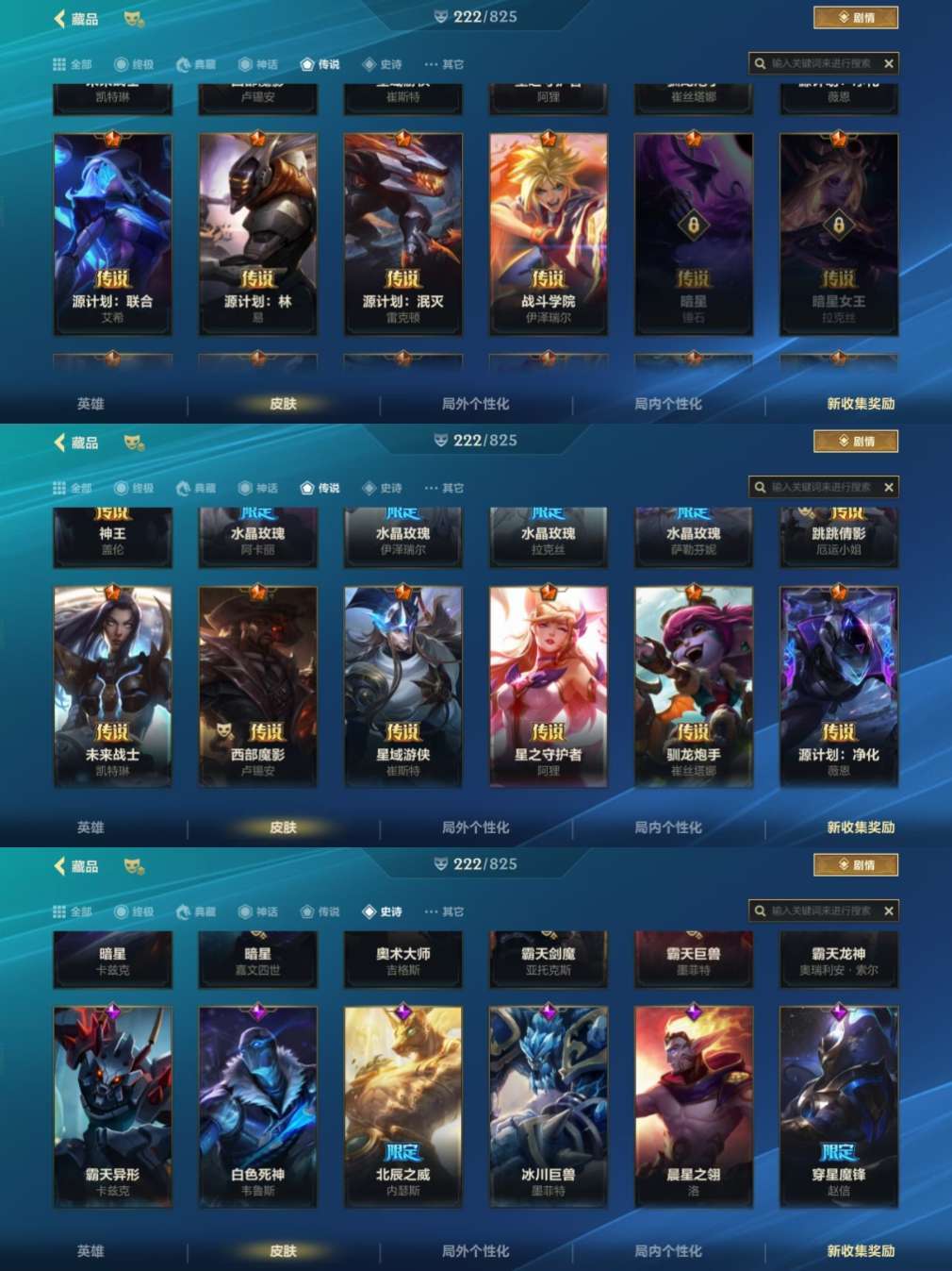222皮 28传说 水晶玫瑰系列差两个 掠星魔刃 系列有 卡萨丁 剑圣 赵信 赵子龙 赵信 牛年限定全有 北辰之威 西宙之辉 其他皮肤自己看截图 毁号行为涉及毁坏虚拟财产罪及计算机安全罪,请文明游戏素质游戏,让我们共建美好租号平台!