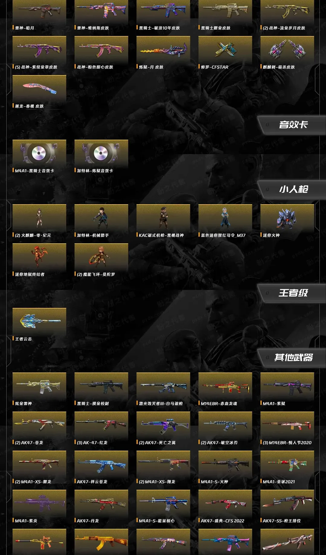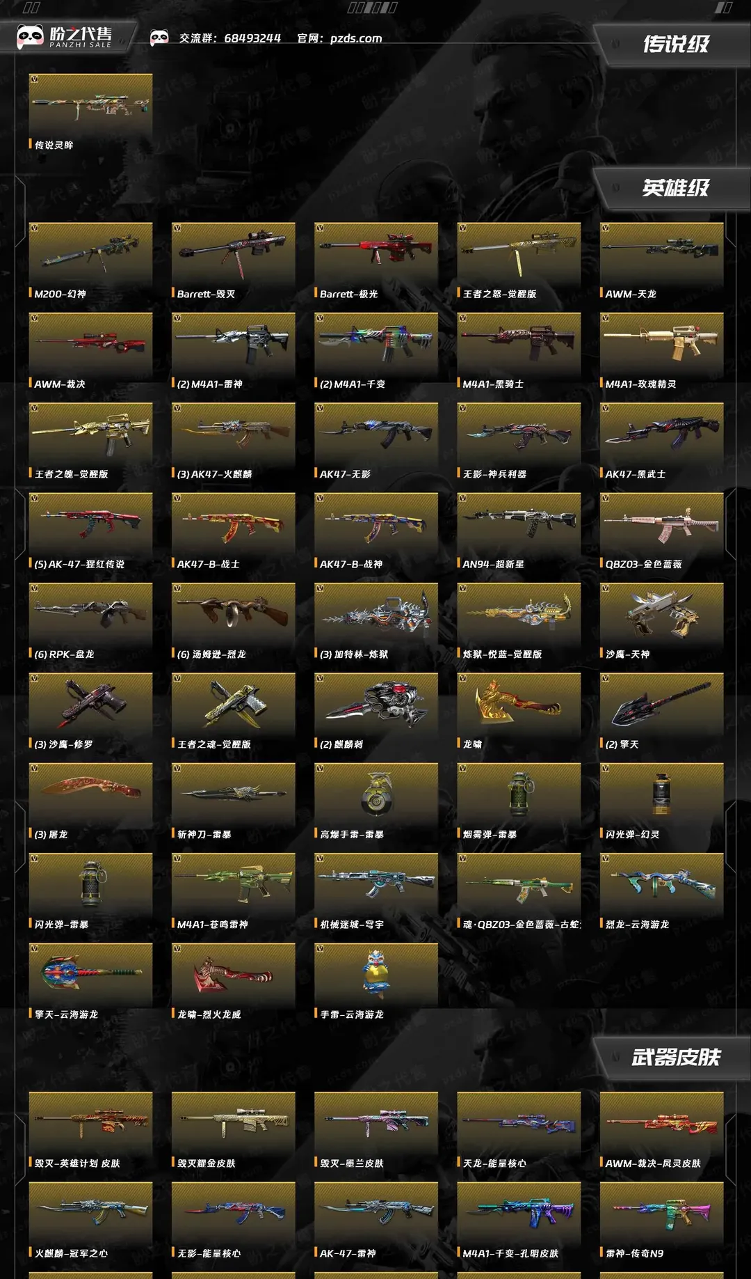 英雄武器:无影-神兵利器;机械迷城-穹宇;AK47-火麒麟;麒麟刺;烈龙-云海游龙;M4A1-雷神;擎天-云海游龙;手雷-云海游龙;QBZ03-金色蔷薇;RPK-盘龙;传说灵眸;M200-幻神;闪光弹-幻灵;Barrett-极光;龙啸-烈火龙威;加特林-炼狱;斩神刀-雷暴;高爆手雷-雷暴;烟雾弹-雷暴;闪光弹-雷暴;AK-47-猩红传说;AK47-黑武士;AK47-B-战神;AK47-B-战士;AN94-超新星;擎天;沙鹰-修罗;M4A1-千变;M4A1-玫瑰精灵;汤姆逊-烈龙;屠龙;AWM-裁决;龙啸;M4A1-黑骑士;AWM-天龙;Barrett-毁灭;沙鹰-天神;AK47-无影