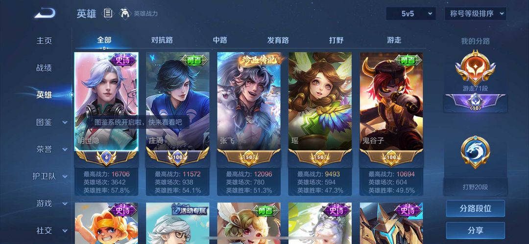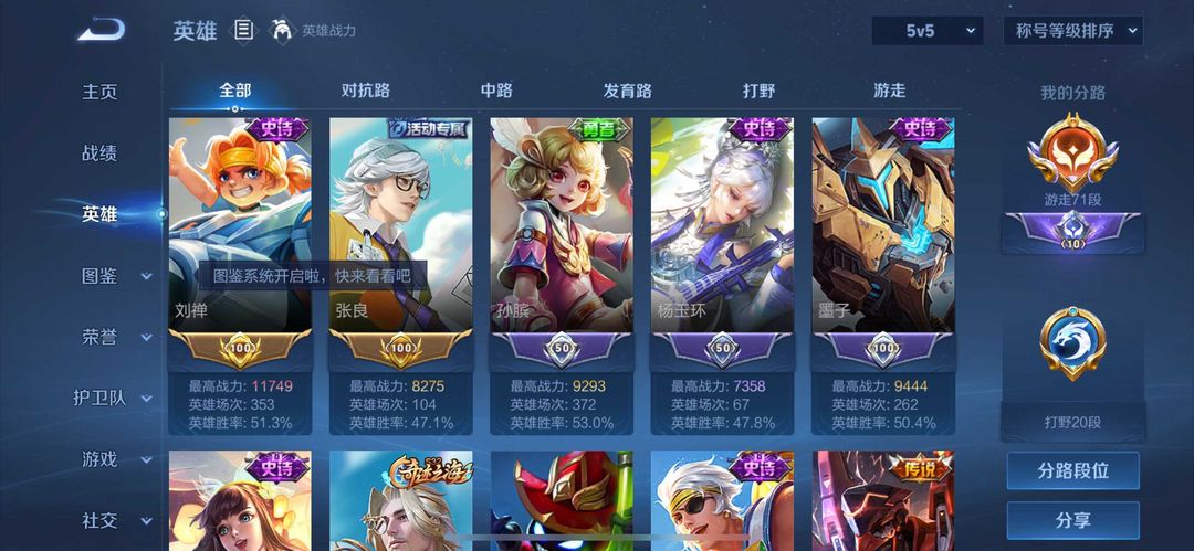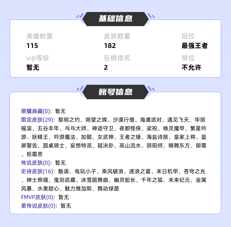 本游戏账号: V5用户,基础段位:至尊星耀I,英雄多,皮肤多。 私人所属英雄皮肤有:达摩 沙漠行僧||雅典娜 黎明之约||女娲 朔望之晖曹操 幽灵船长||吕布 末日机甲||李元芳 逐浪之夏||宫本武藏 鬼剑武藏||不知火舞 魅语||夏侯惇 乘风破浪||鲁班七号 电玩小子,等等