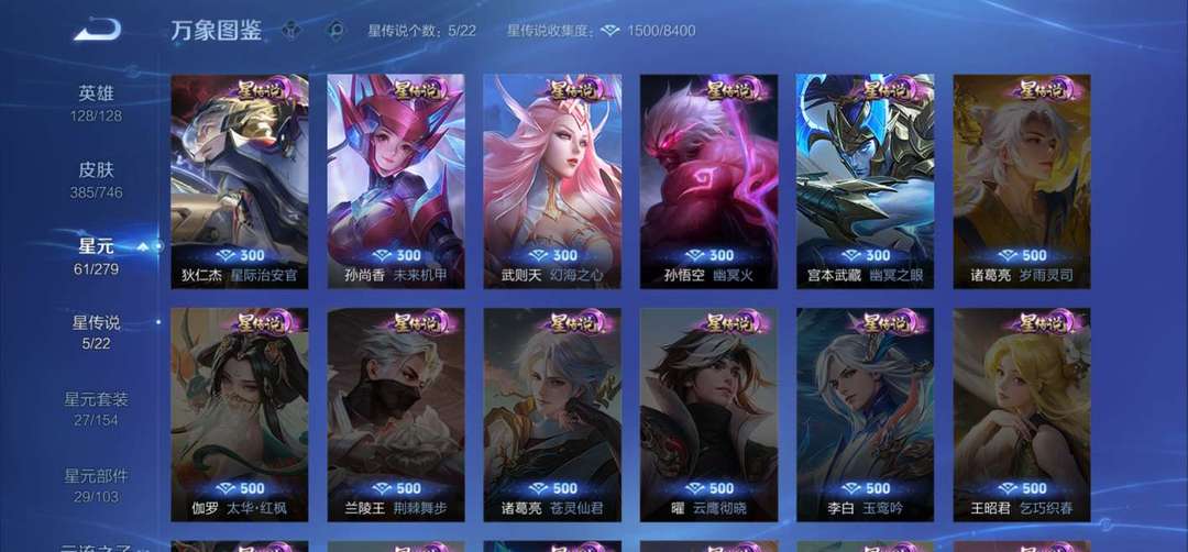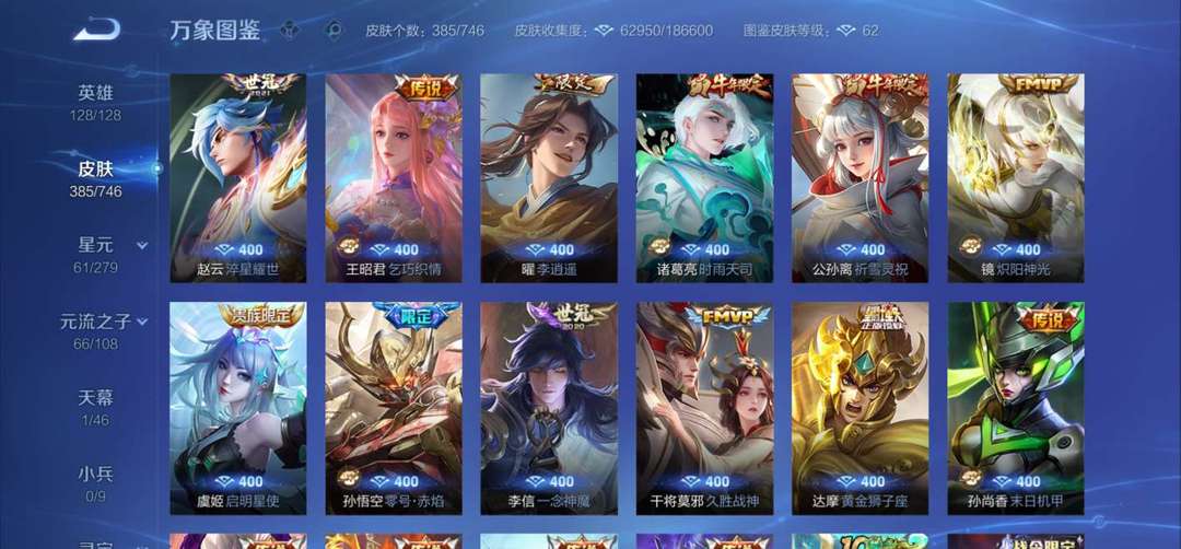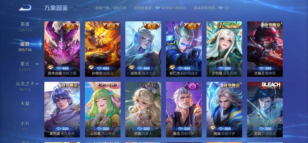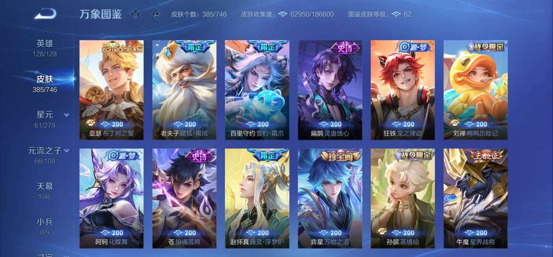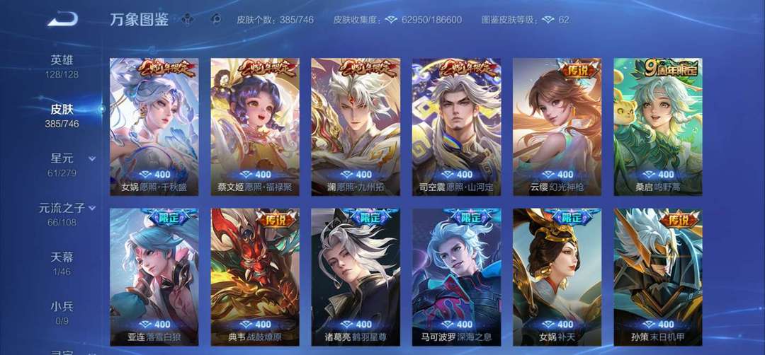 关羽♡驰影疾锋♡李白♡荣耀典藏♡武则天♡海洋之心星传说♡耀♡无双♡蛇年限定全套♡女娲♡补天♡