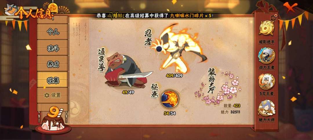 ✨全忍者✨顶级账号✨五影会谈斑✨4235万战力✨九尾水门✨传说自来也✨暴怒六尾✨漂泊带土✨再不斩✨全通灵✨全秘卷✨魅力等级65忍者装扮奥义图都有✨顶级账号带秘境团本瞬秒,如果被顶了请直接顶回去,⚠️段位赛忍者会被禁⚠️所以请各位老板手下留情不要打