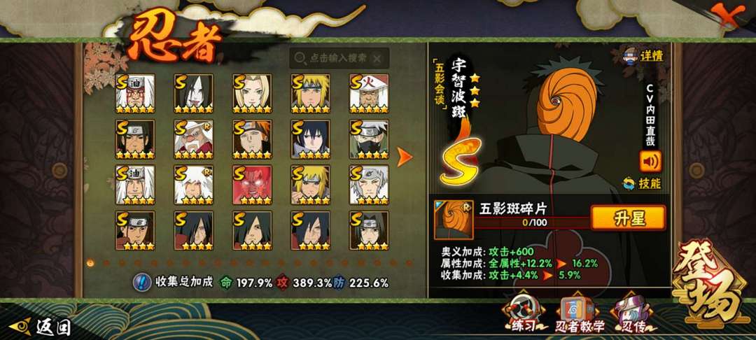 ✨全忍者✨五影斑✨九尾水门✨漂泊带土✨传说自来也✨150团瞬秒✨4235万战力✨麻烦好评一下谢谢✨